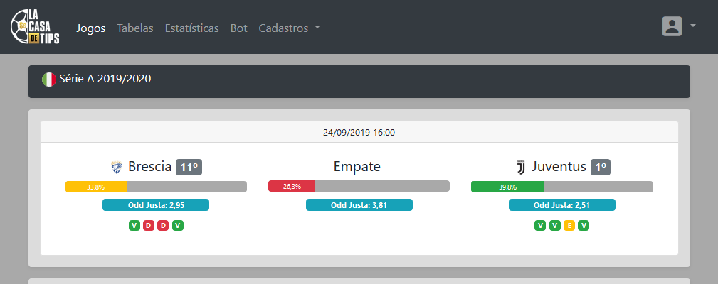 Só existe uma forma de ser um apostador lucrativo no longo prazo: adquirindo EV+ nas suas apostas. Porém, na grande maioria das vezes, as casas de aposta lhes oferece uma ODD menor do que a justa para cada evento das partidas. O nosso Sistema de Probabilidades e Estatísticas, através de cálculos, fórmulas e fatores, te traz a ODD JUSTA para cada evento, bastando você comparar com as ODDS oferecidas pelas casas para determinar se o valor é o justo.